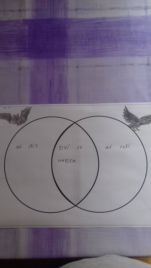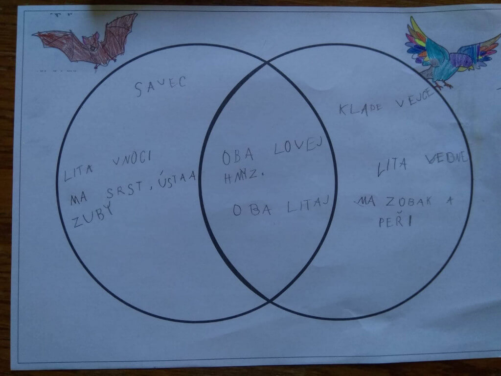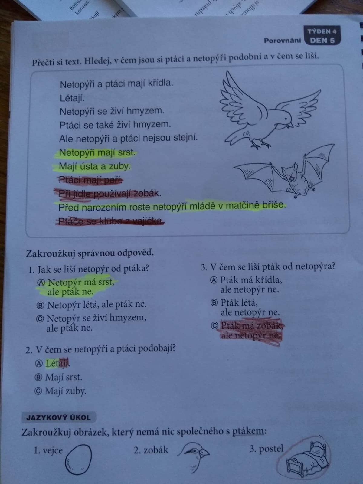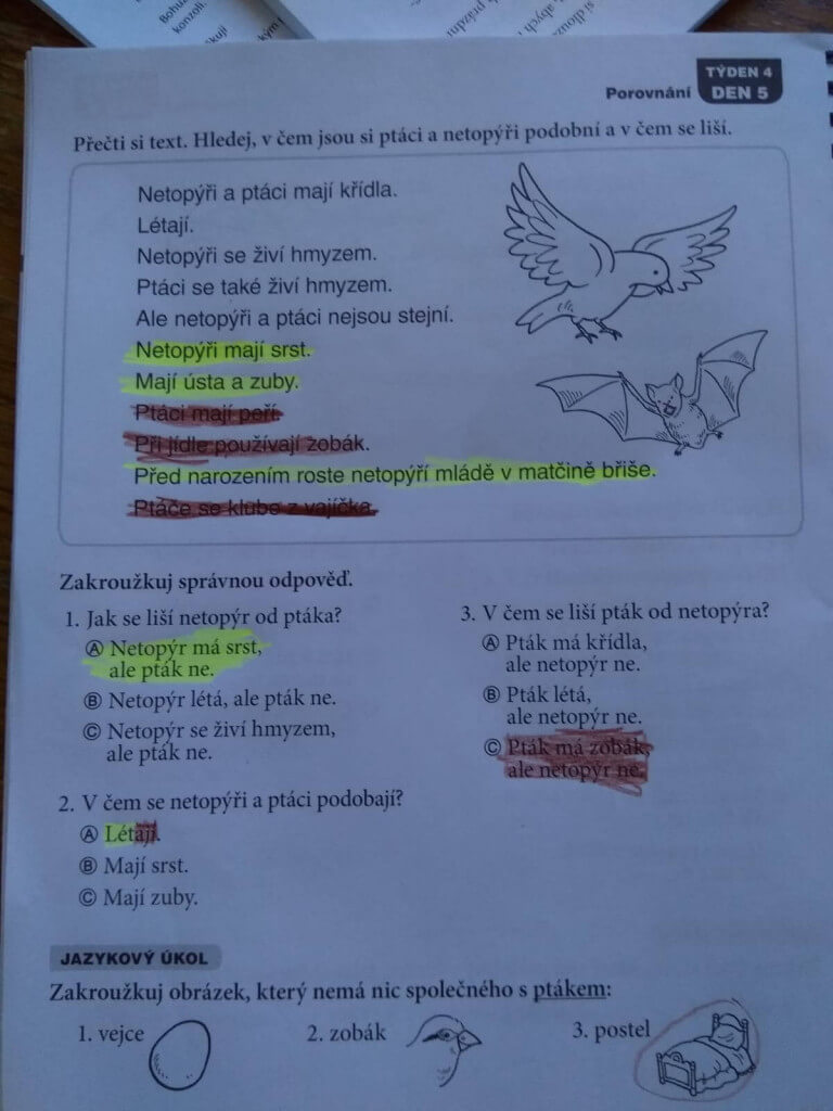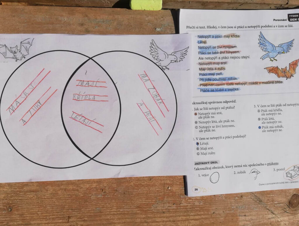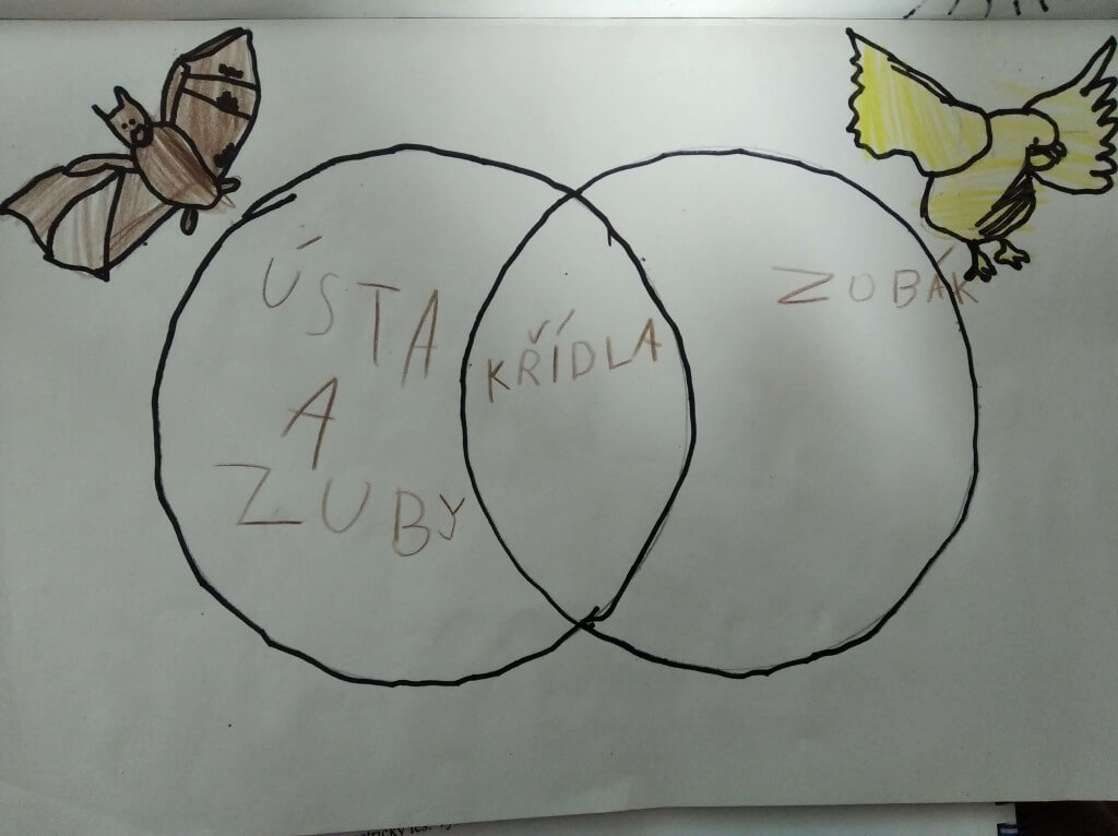 Ústně se zamyslím, co mají společného a co je rozdílné. Takto připraven jdu číst. Dvě zvolené pastelky jsou připraveny k akci. Jedna pastelka je netopýr, druhá je pták.