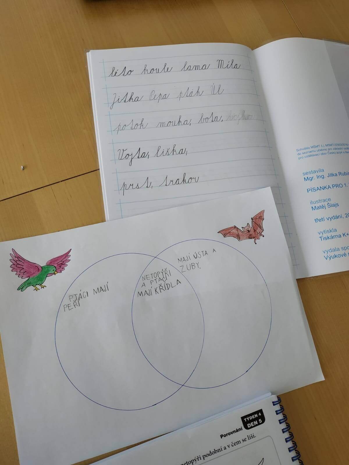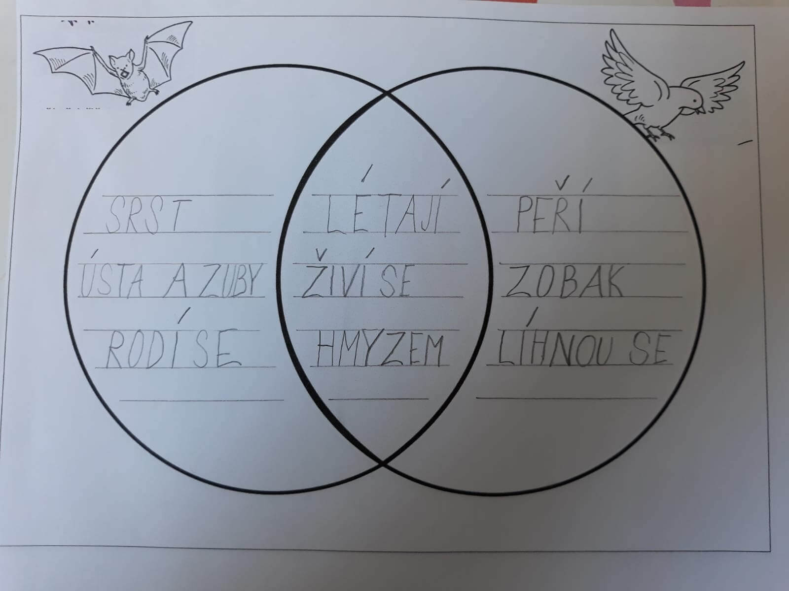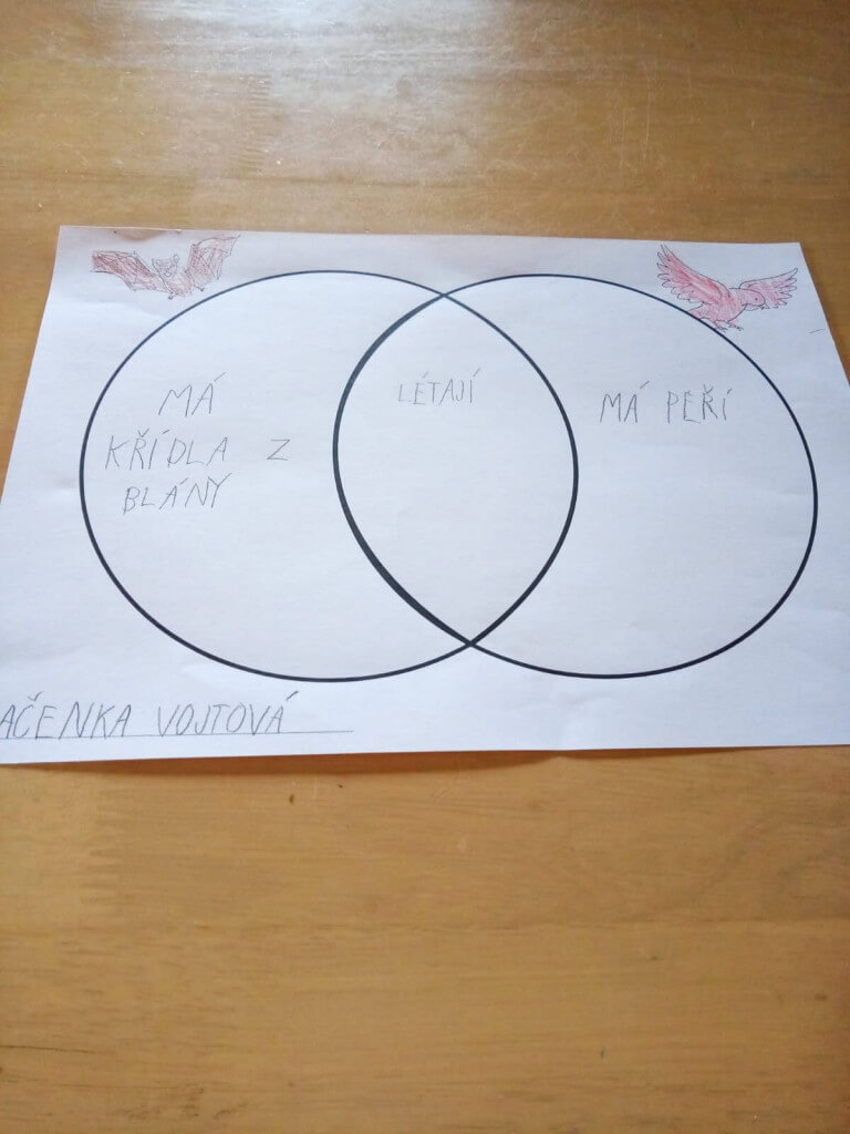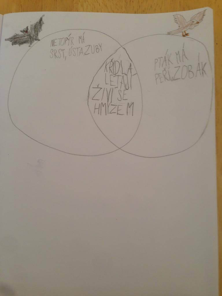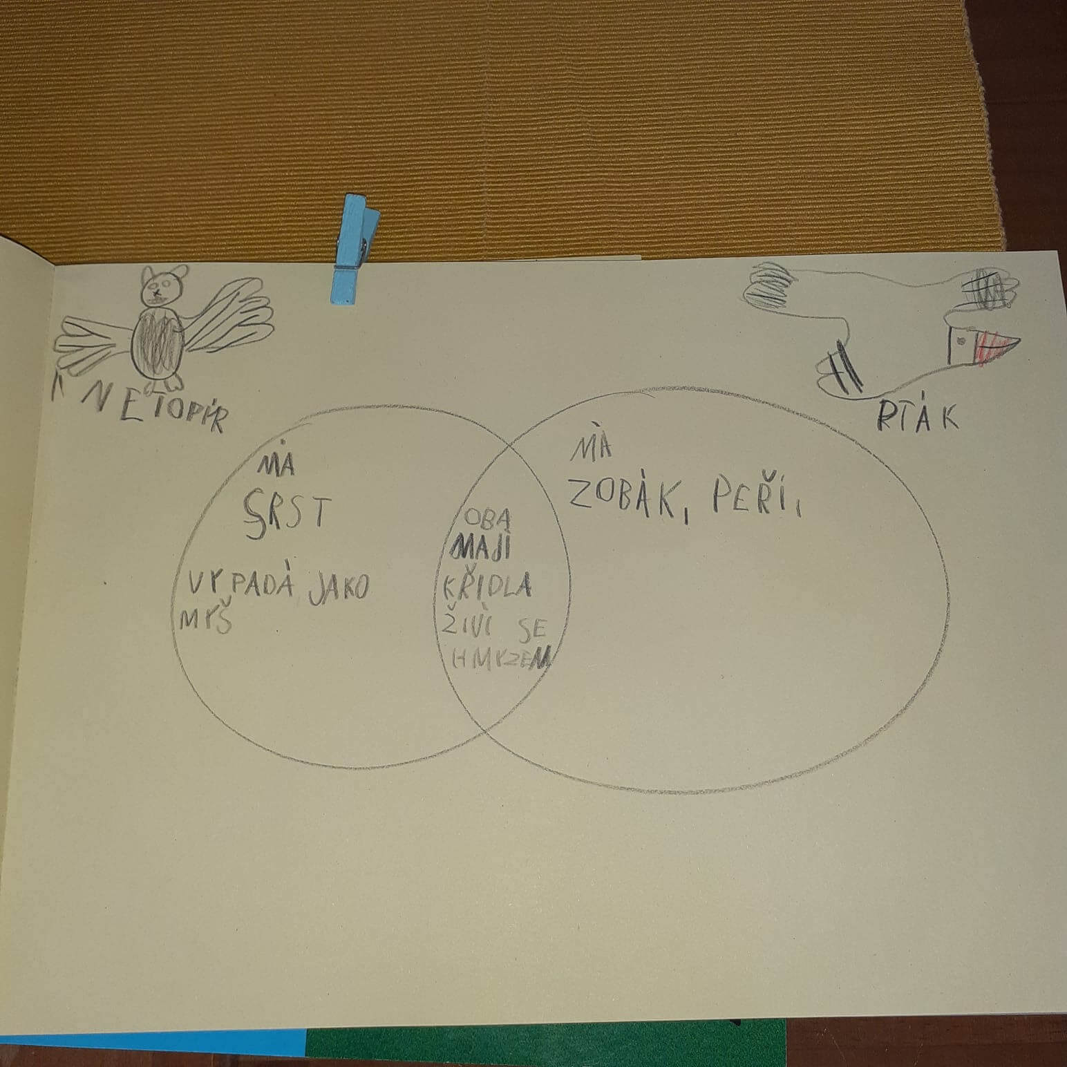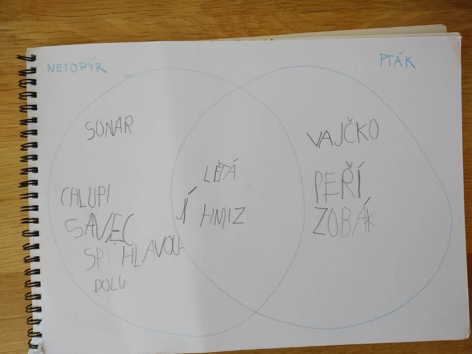Ústně se zamyslím, co mají společného a co je rozdílné. Takto připraven jdu číst. Dvě zvolené pastelky jsou připraveny k akci. Jedna pastelka je netopýr, druhá je pták.