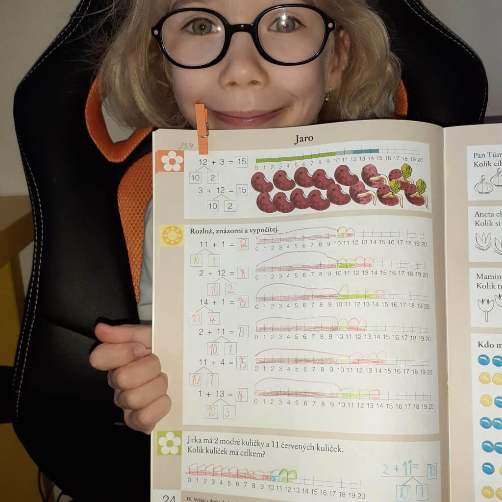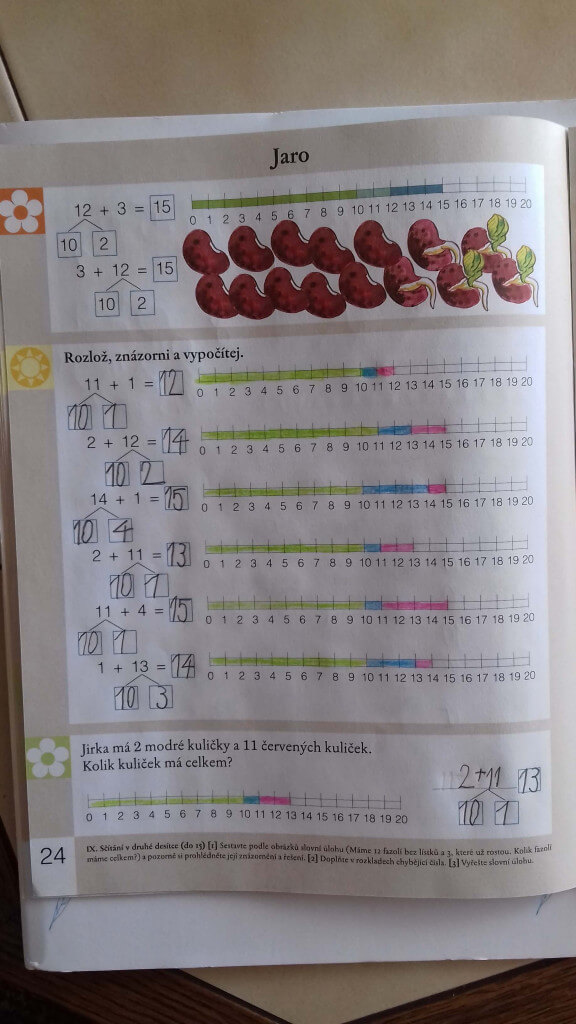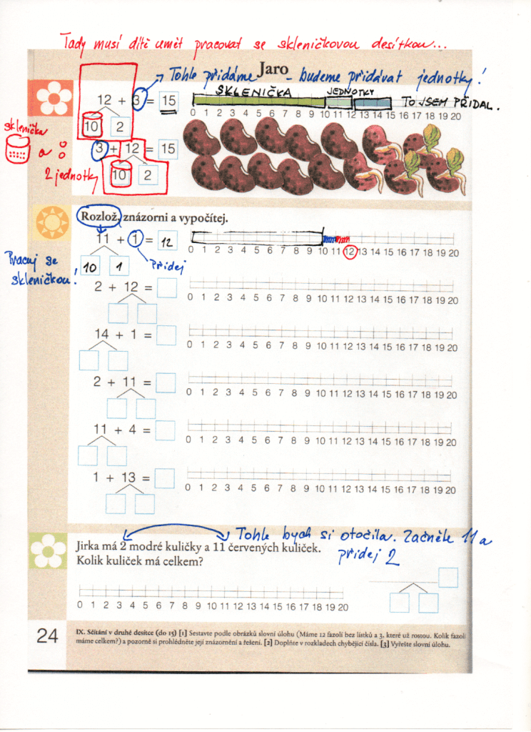 Určitě si před prací v pracovním sešitě vezměte skleničku a jednotky a toto si několik kol zahrajte. Zapisujte na papír. Jste-li si jisti, že dítko rozumí, pracujte v sešitě. Důležitá je i práce s číselnou osou, tu nevynechte. Opoznámkovala jsem výtisk dnešní stránky, třeba též pomůže.