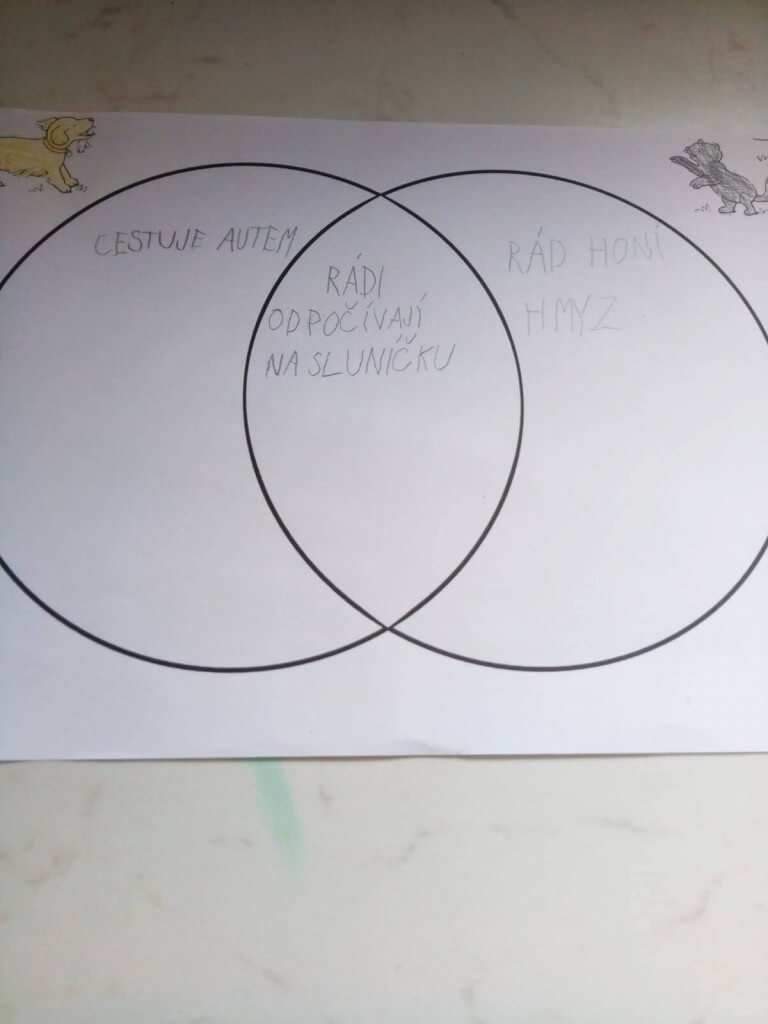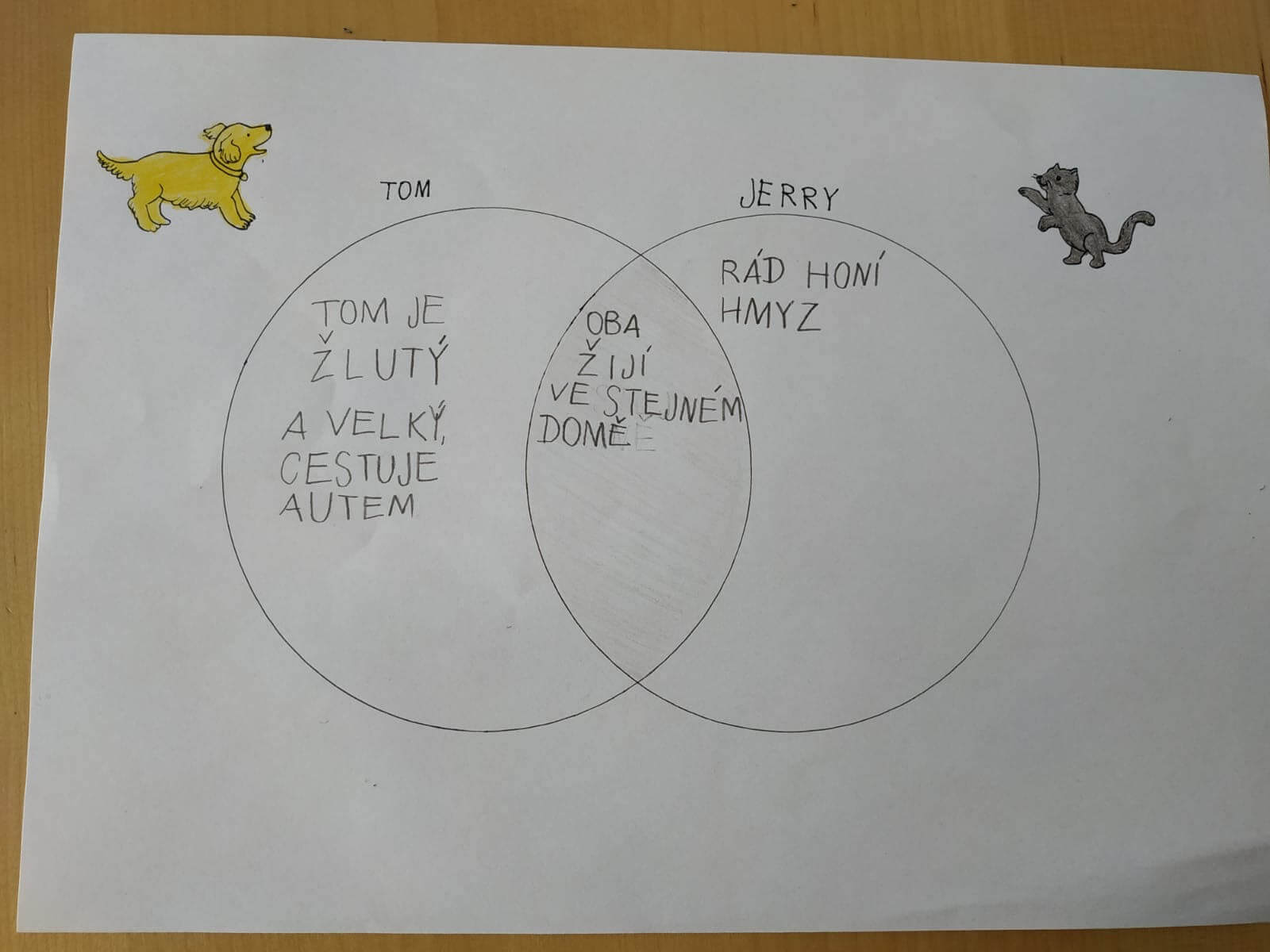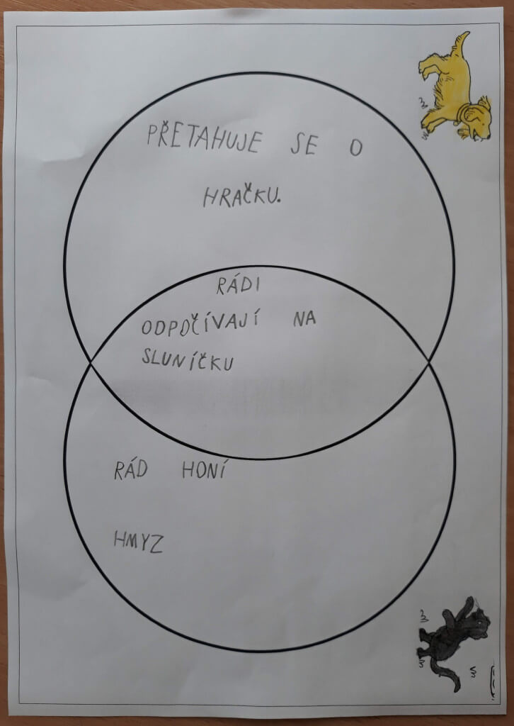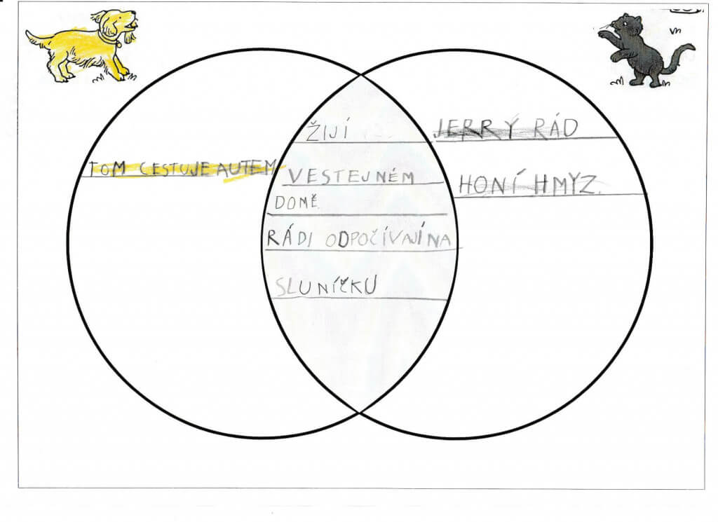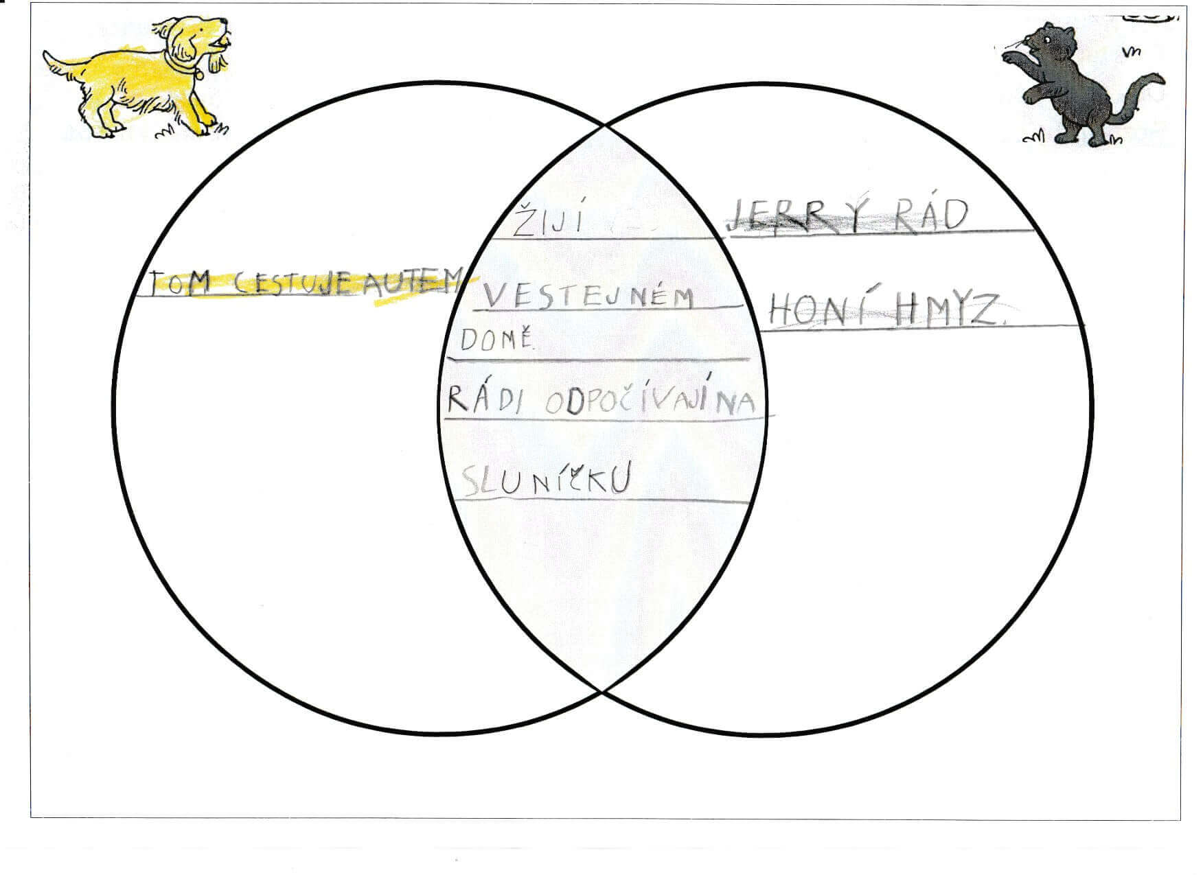 Připomeneme si, co se do Vennových diagramů zaznamenává a jakým způsobem. Děti určitě nezapomněly. Sám pracovní list napovídá, co budeme porovnávat – dva domácí mazlíčky: pejska Toma a kocourka Jerryho. Před čtením zkusíme společně s dětmi předvídat, co mohou mít kocour a pes společného a v čem se naopak mohou lišit. Tyto úvahy nezaznamenáváme, vedeme pouze ústní rozhovor.
