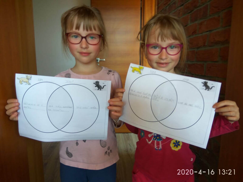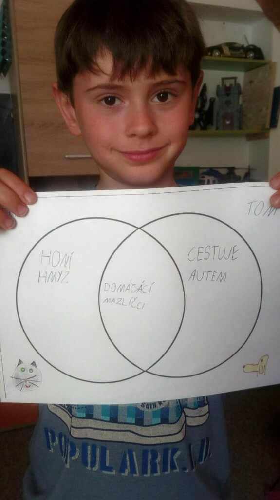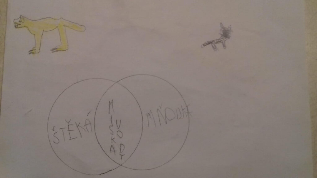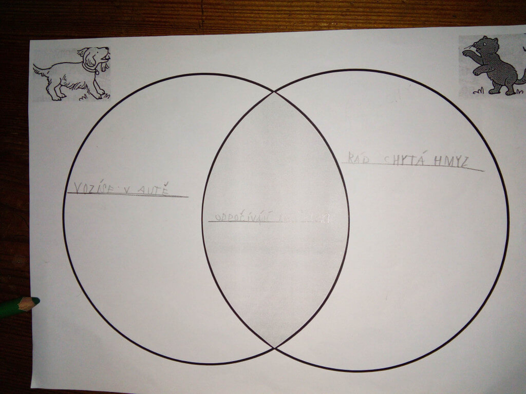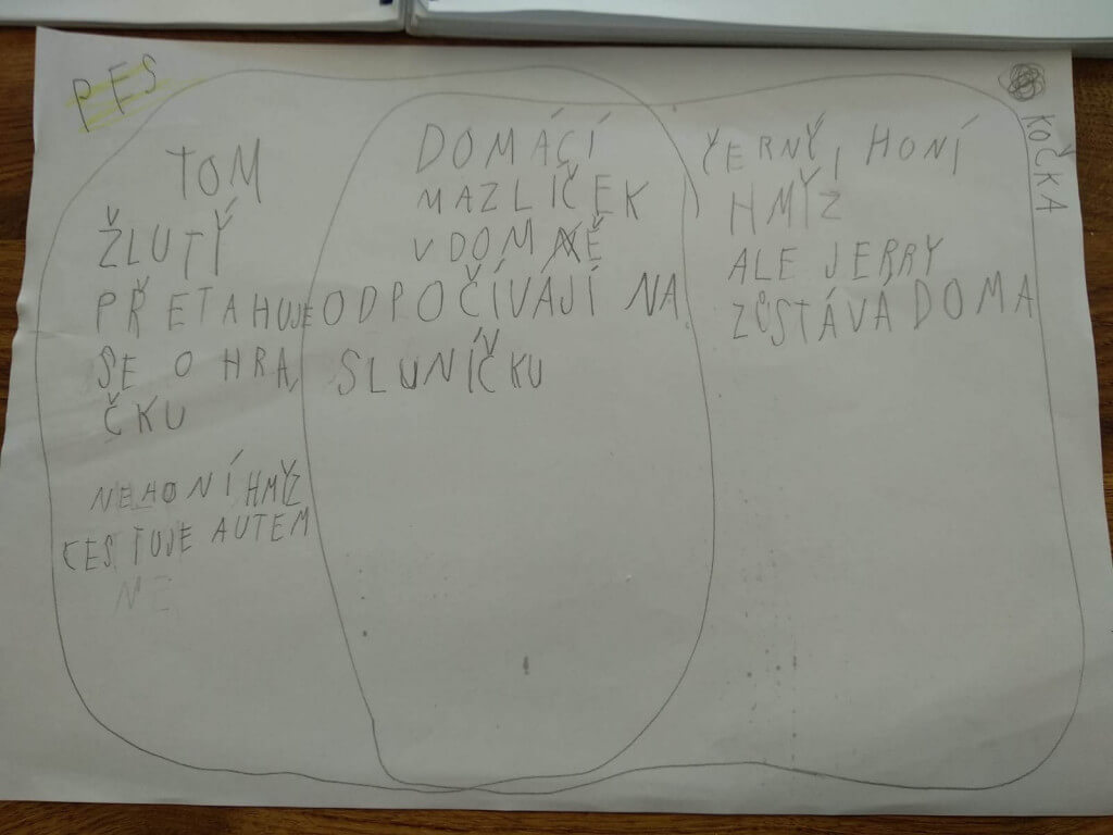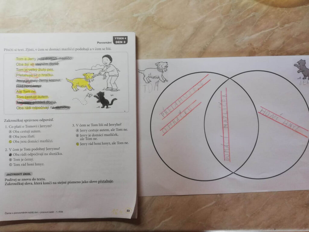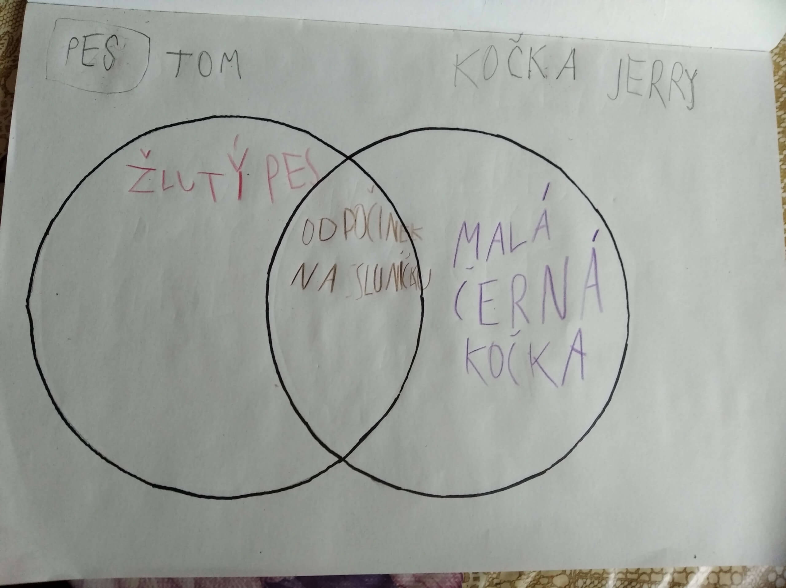 Připomeneme si, co se do Vennových diagramů zaznamenává a jakým způsobem. Děti určitě nezapomněly. Sám pracovní list napovídá, co budeme porovnávat – dva domácí mazlíčky: pejska Toma a kocourka Jerryho. Před čtením zkusíme společně s dětmi předvídat, co mohou mít kocour a pes společného a v čem se naopak mohou lišit. Tyto úvahy nezaznamenáváme, vedeme pouze ústní rozhovor.