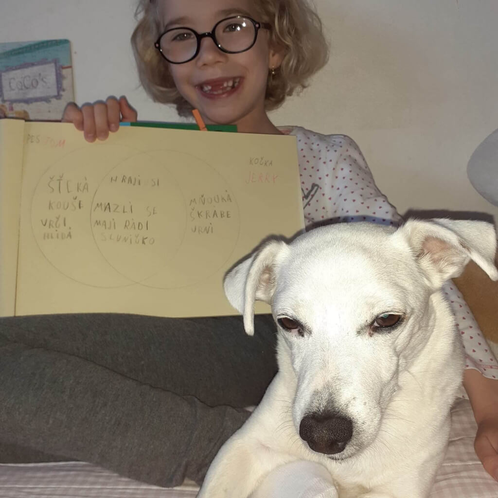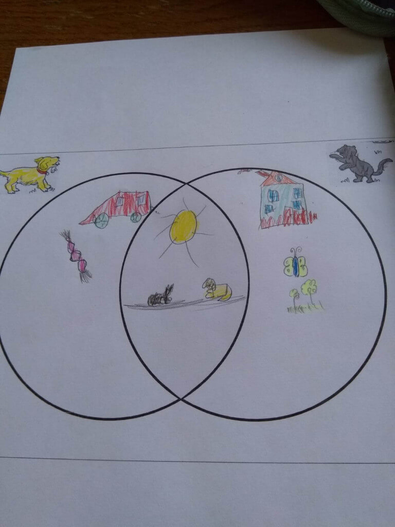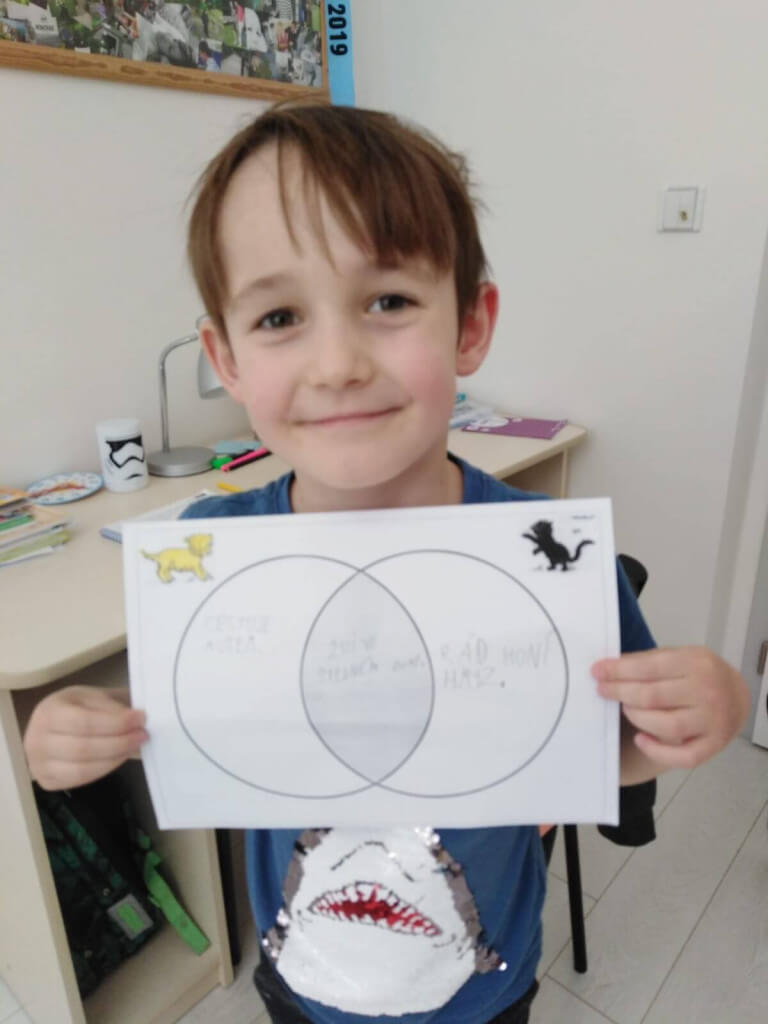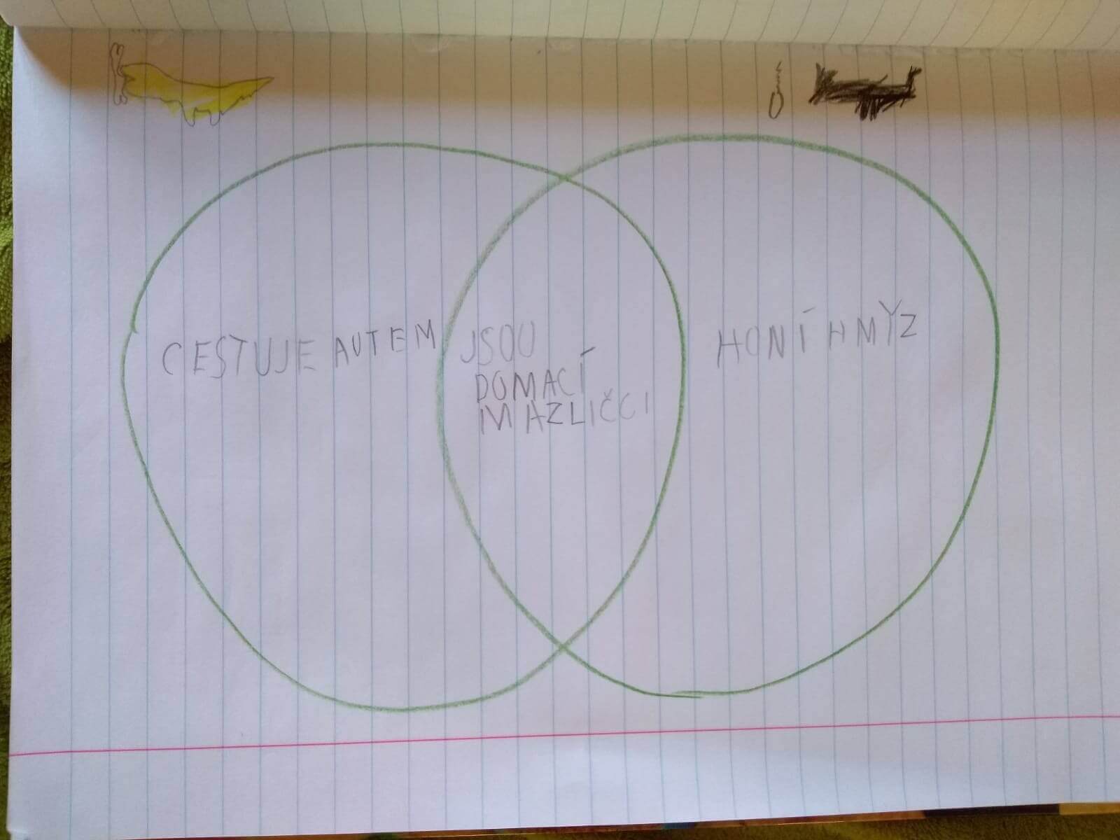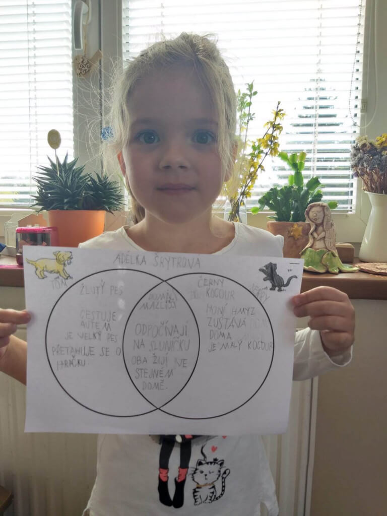 Připomeneme si, co se do Vennových diagramů zaznamenává a jakým způsobem. Děti určitě nezapomněly. Sám pracovní list napovídá, co budeme porovnávat – dva domácí mazlíčky: pejska Toma a kocourka Jerryho. Před čtením zkusíme společně s dětmi předvídat, co mohou mít kocour a pes společného a v čem se naopak mohou lišit. Tyto úvahy nezaznamenáváme, vedeme pouze ústní rozhovor.