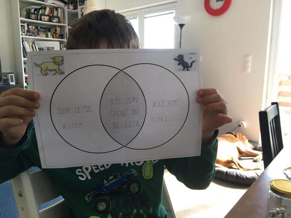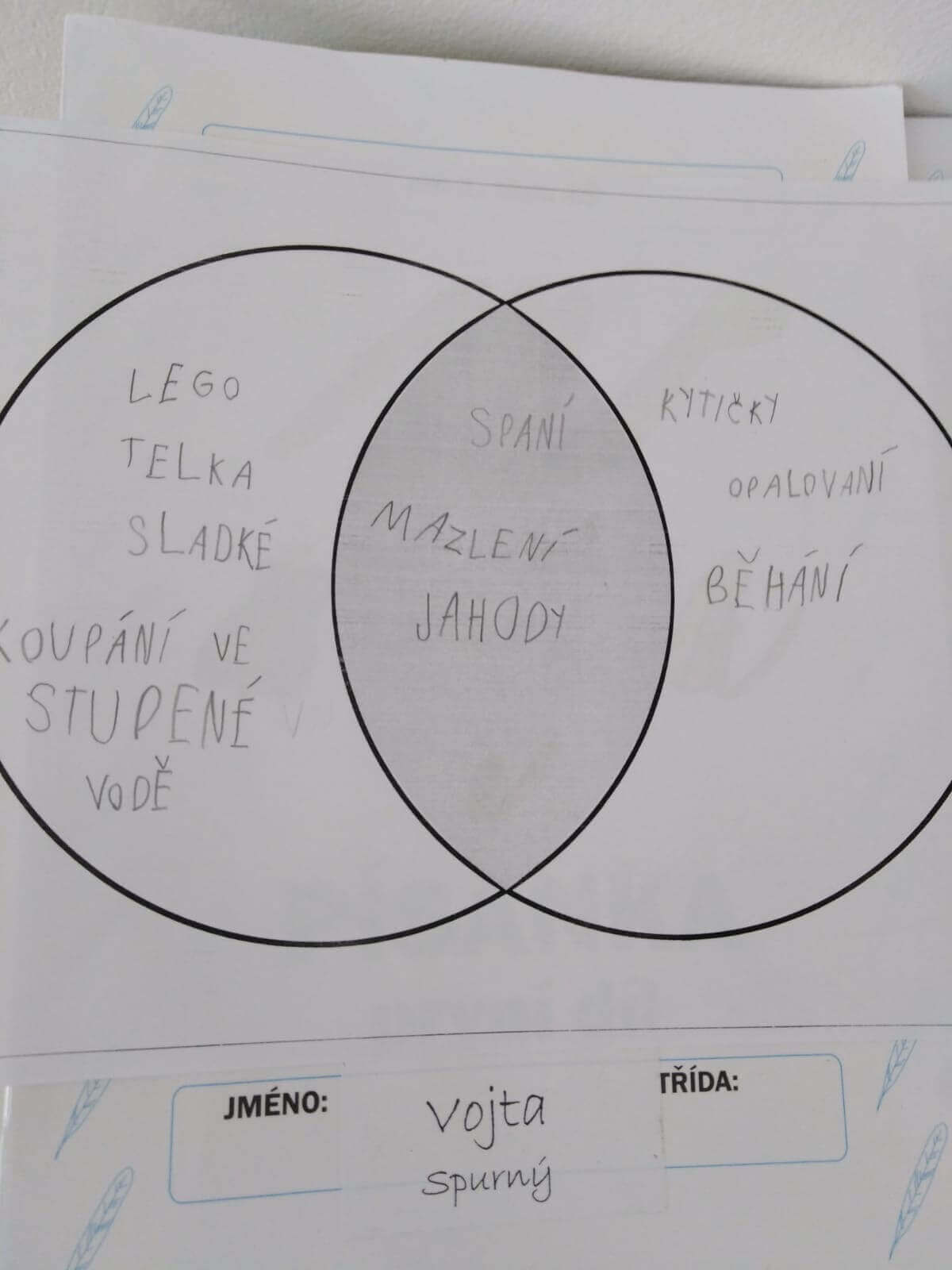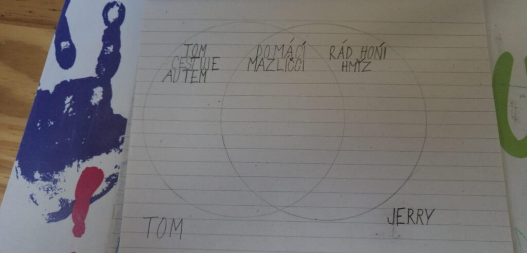 Pracovní list, který jsme v úvodu prohlíželi. Vytiskneme / překreslíme do deníku/ a dítko vyplní. V každém poli stačí jediný záznam. Jednu věc napíši tedy k Tomovi, jednu napíši k Jerrymu a jednu vyberu, která je společná.