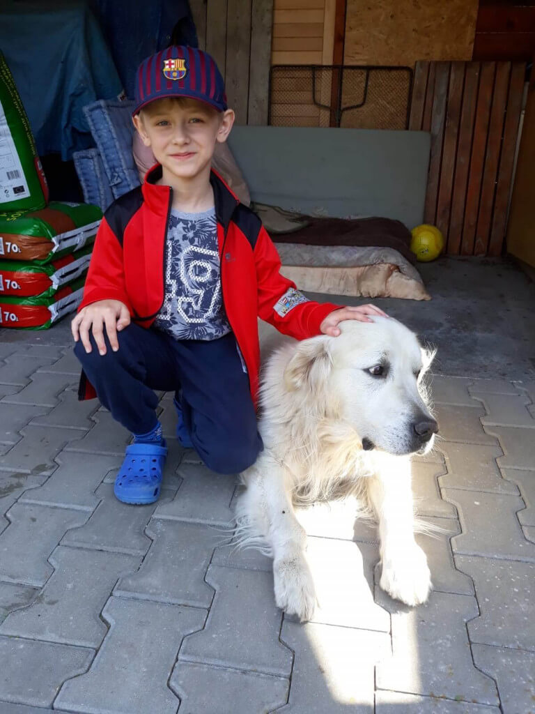 Tom je zřejmě zlatý retrívr, protože je žlutý. Vybarvíme ho. TIP: Vygooglete dětem zlatého retrívra, budou mít větší představu.