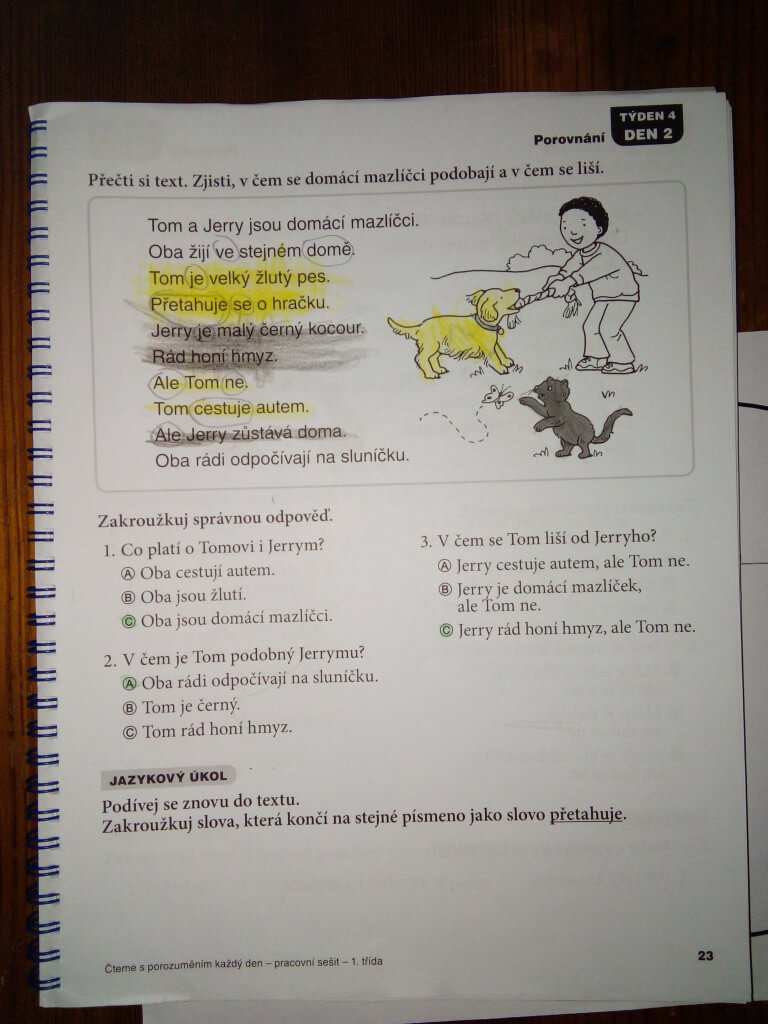 Obě pastelky budeme opět užívat u čtení. Co je psí, bude žluté, co je kocourovo, bude černé. /Dítko by mělo vybarvovat tak, aby se k textu mohlo kdykoliv vrátit. Zkrátka lehce./