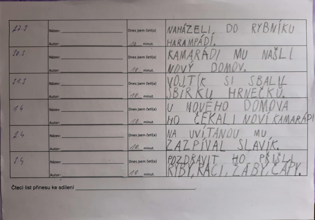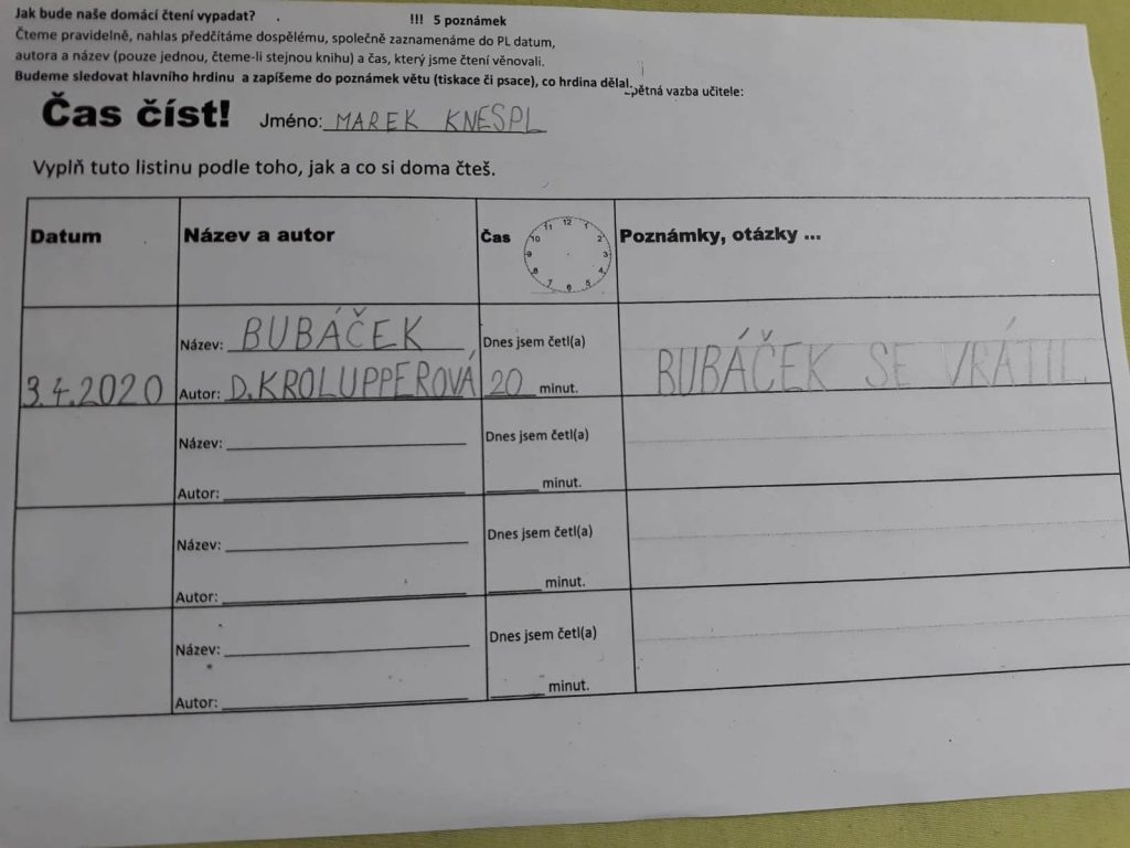 - Knihomolové budou číst ze svých knih minimálně 10 minut v kuse. Svoji četbu povinně zaznamenají do pracovního listu Čas číst, který byl přiložen v balíčku karanténa. Není to dílna čtení, čteš tedy nahlas někomu dospělému.