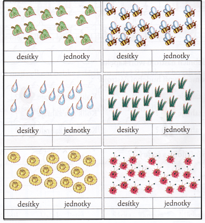 Teď jsme krásně připraveni na str. 10/ oranžová kytka / poslední, modrý sloupek. Dítě samo čte číslice a zapisuje do tabulky.