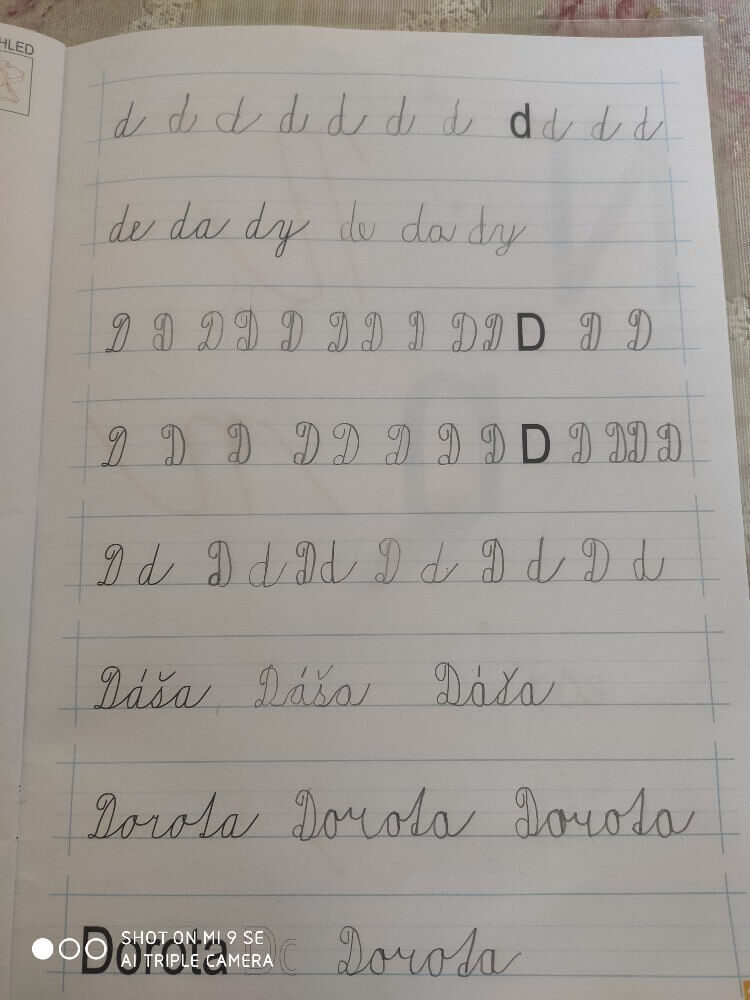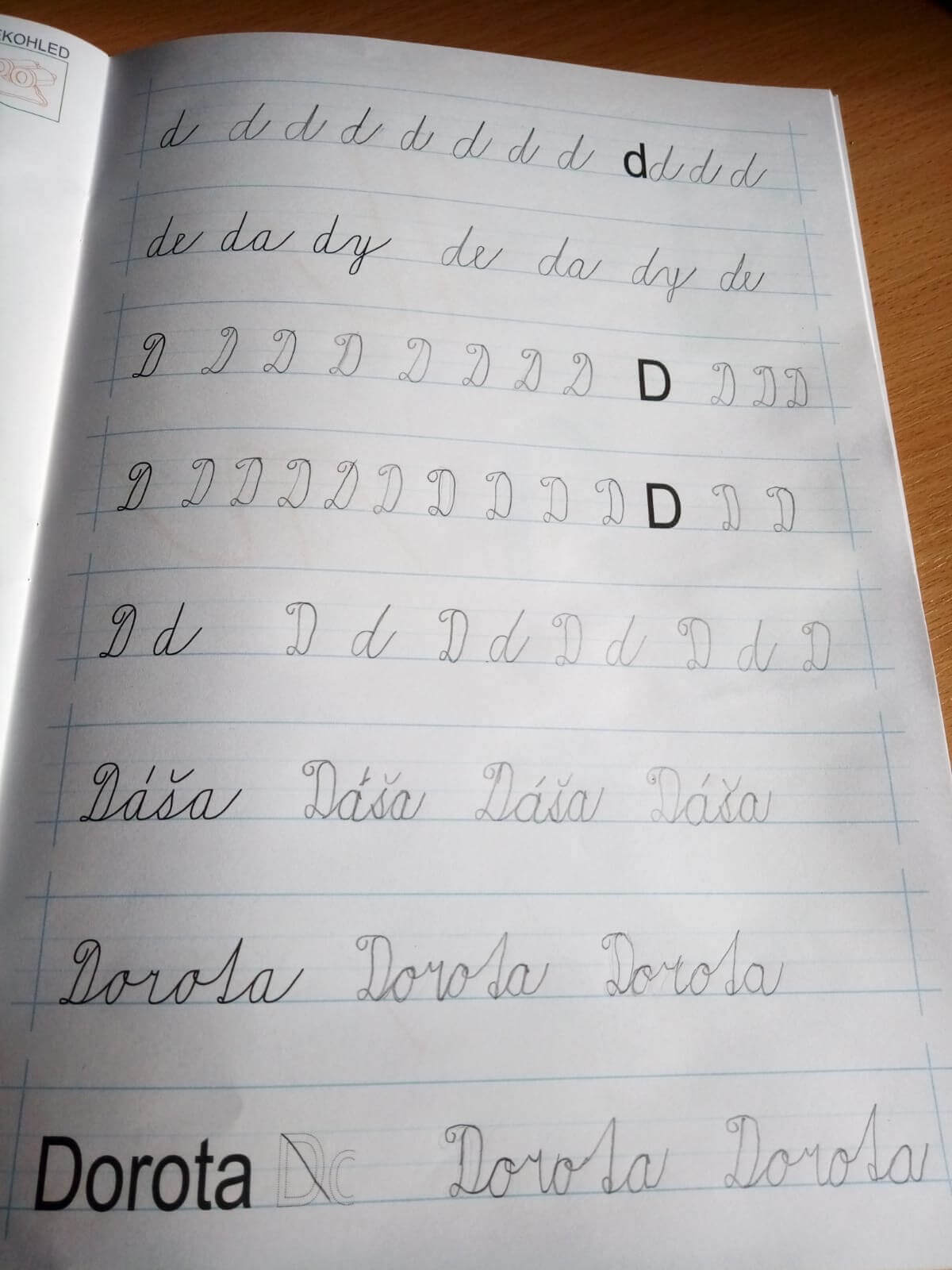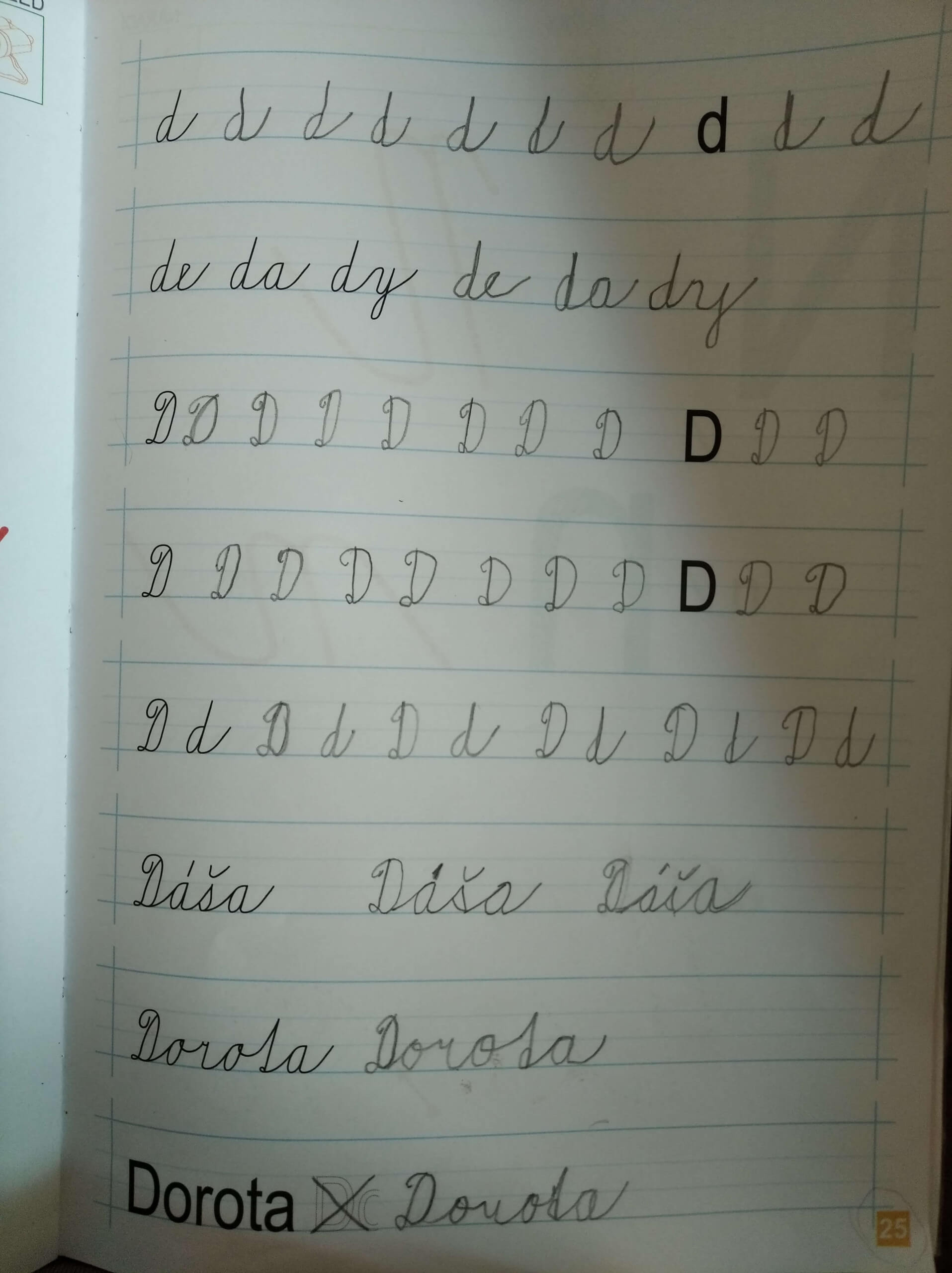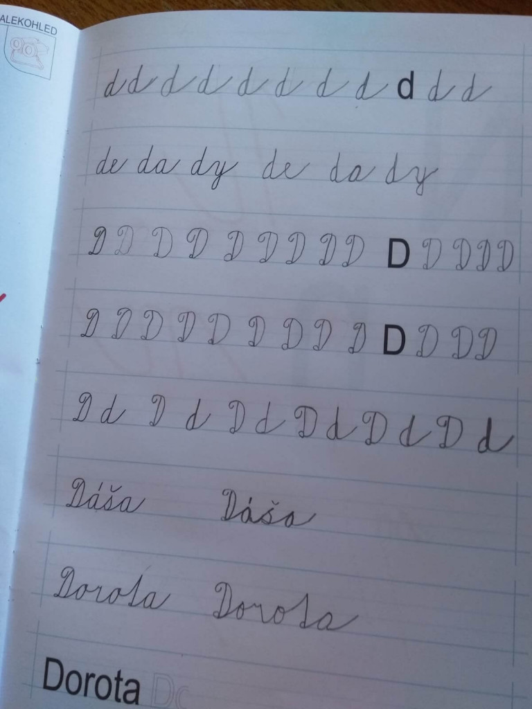 Malé psací d je pro děti snadné, vychází z písmene psacího a, jen vytáhne „žerď “ k horní lince. Písmeno velké psací D nám pak všechny možné komplikace vynahradí.