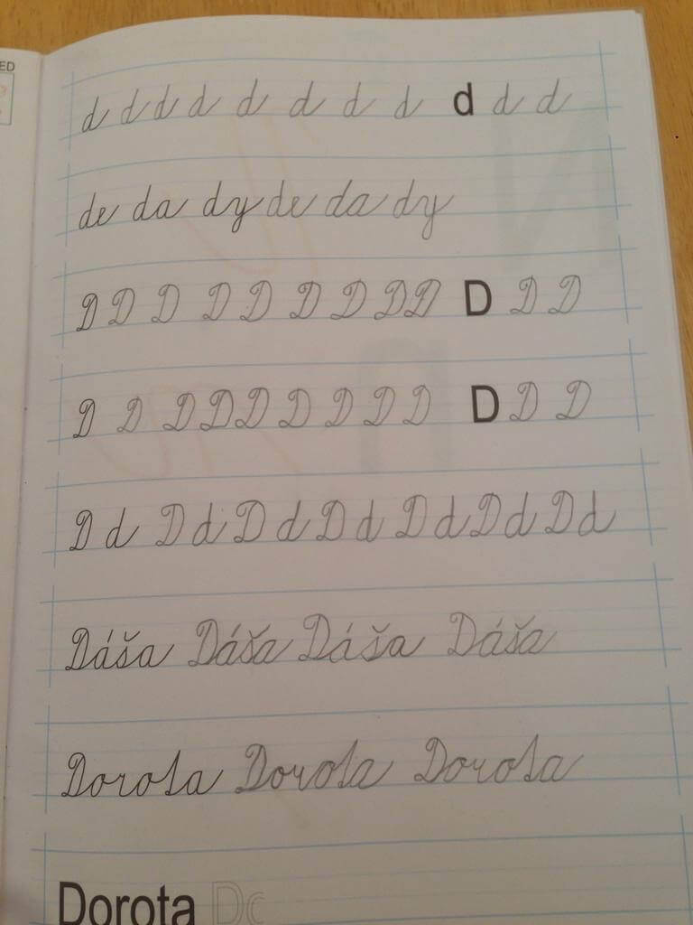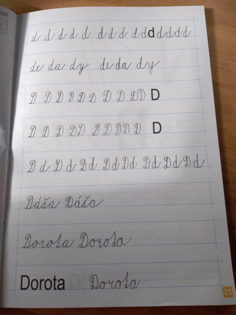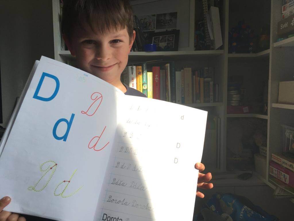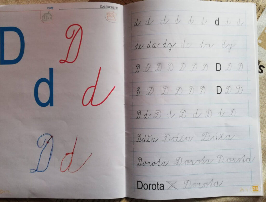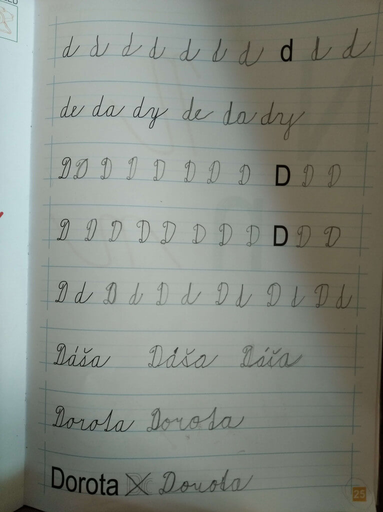 Malé psací d je pro děti snadné, vychází z písmene psacího a, jen vytáhne „žerď “ k horní lince. Písmeno velké psací D nám pak všechny možné komplikace vynahradí.