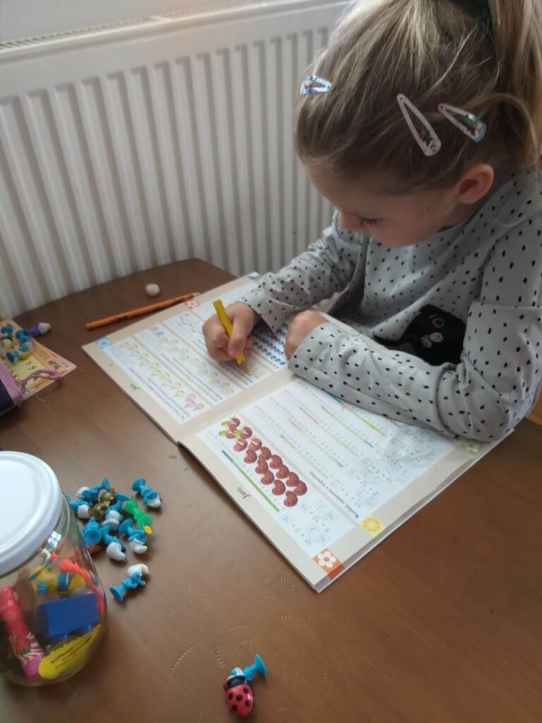 Pokračujeme v nácviku přidávání jednotek z předešlého dne. Před prací v pracovním sešitě je vhodné zopakovat porozumění praktickou částí se skleničkou a jednotkami a zapisovat příklady na papír.