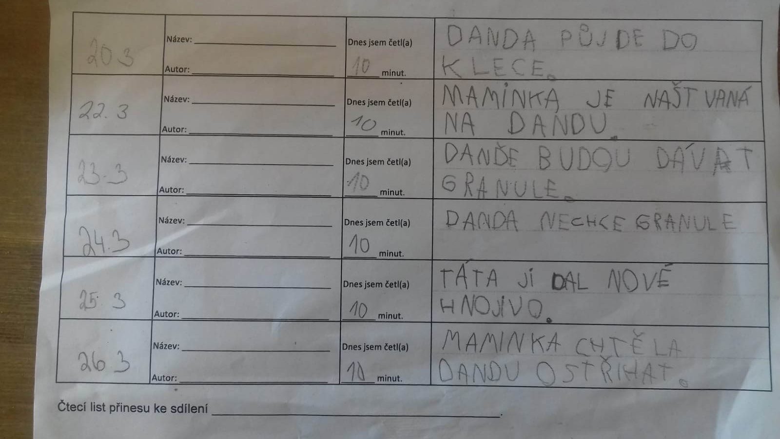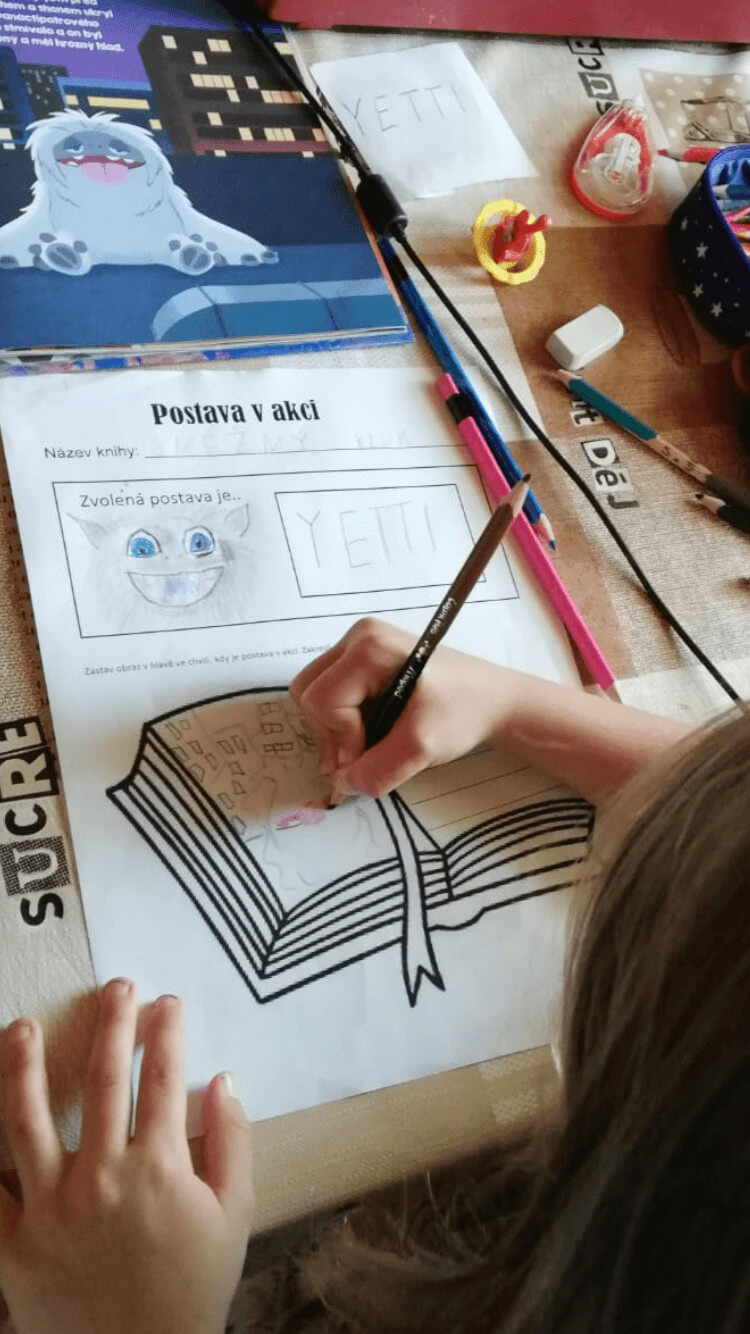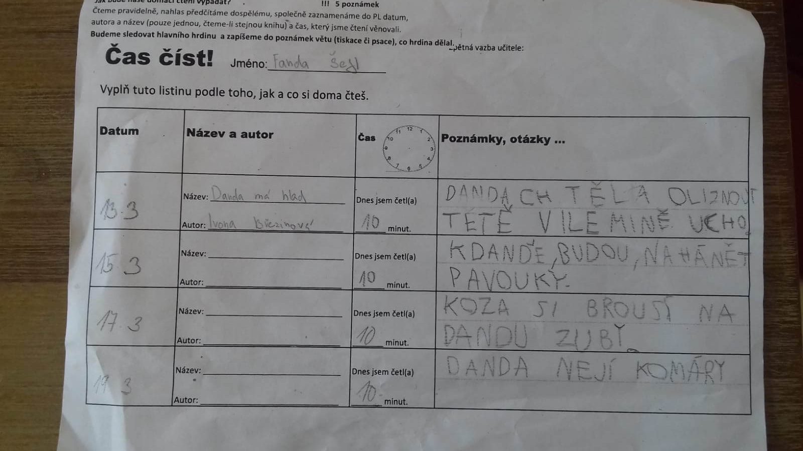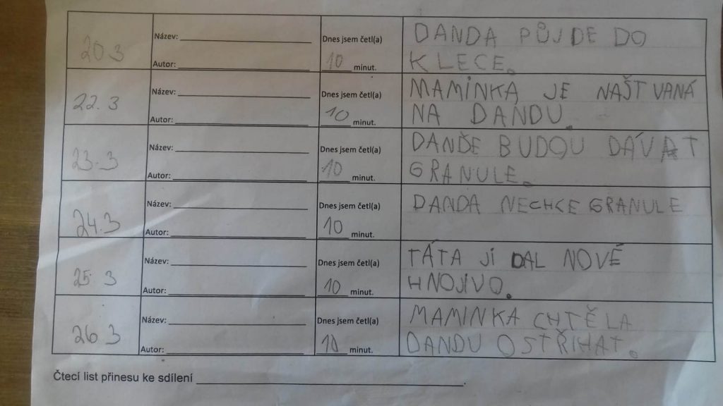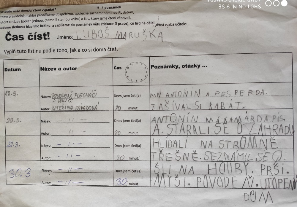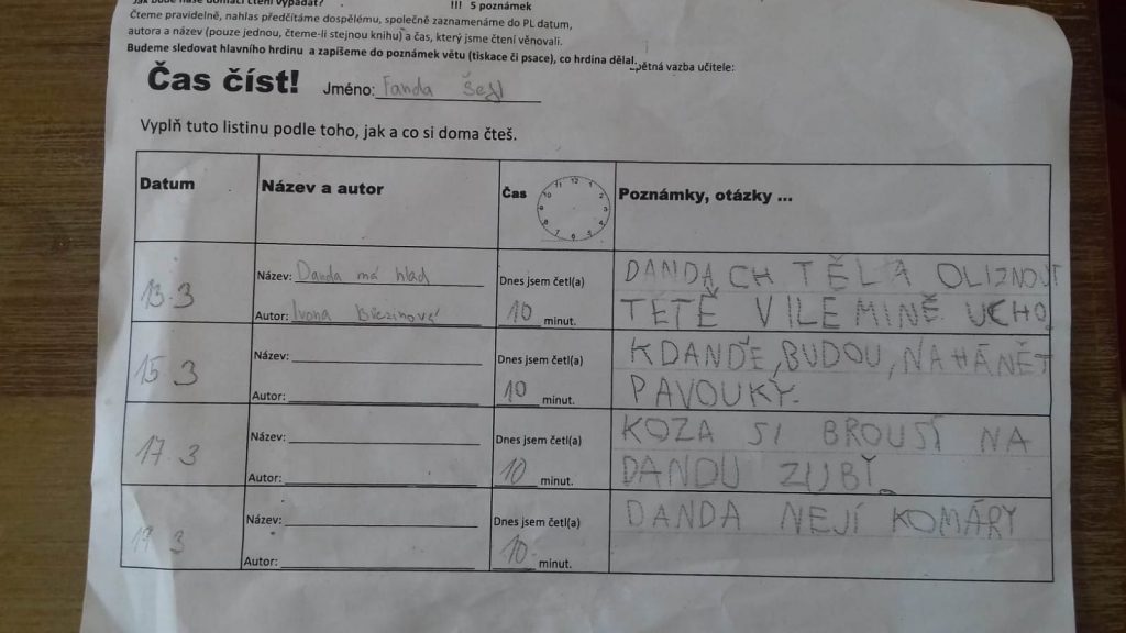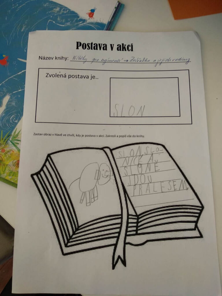 Dneska budeme číst 10 minut. Při čtení budeme sledovat hlavní postavu knihy a hodně se budeme soustředit, co postava dělá. To po čtení zaznamenáme buď do DENÍKU nebo do grafického organizéru – to je ten pracovní list POSTAVA V AKCI. Zvol si, co Ti bude vyhovovat.