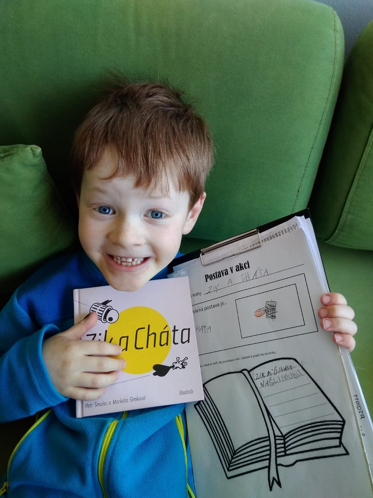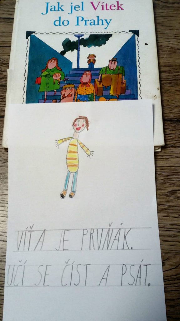 Cílem čtenářské dílny není v žádném případě nácvik a dril techniky čtení. /To bychom tomu tedy dali, Čapkův povzdech :)/ Správné čtenářské dílny směřují k jedinému cíli: Najít lásku ke knihám. Najít se jako čtenář. Poznat, které knihy mě baví a čím to je, umět se o radost ze čtení podělit, sdílet myšlenky a názory s druhými, někdy se i přít… Nacházet v knihách život…. A děti je milují. Rádi skrze svoji knihu představují sami sebe. Nemohu si odpustit poznámku, že ten spropadenej Virus mi vyfoukl závěrečné gesto na závěr první třídy. Zaslzeli byste nad svým dítkem dojetím. Jenže spropadenej Virus vyfoukl mnoha lidem větší věci, než čtenářské vestičky šité dětem na míru. Takže jsem statečná. A na vestičky jednoho dne dojde…. Než začne dítě číst, připravte si hrnek s jistým relaxačním nápojem, dítě bude číst samo. Bude loutat řádky i obrázky samo, jak samo nejlépe přirozeně dovede. Vy máte volno. Jen mu prosím pomozte připomenout instrukce. Dítko zná, chodí do 1.A 🙂