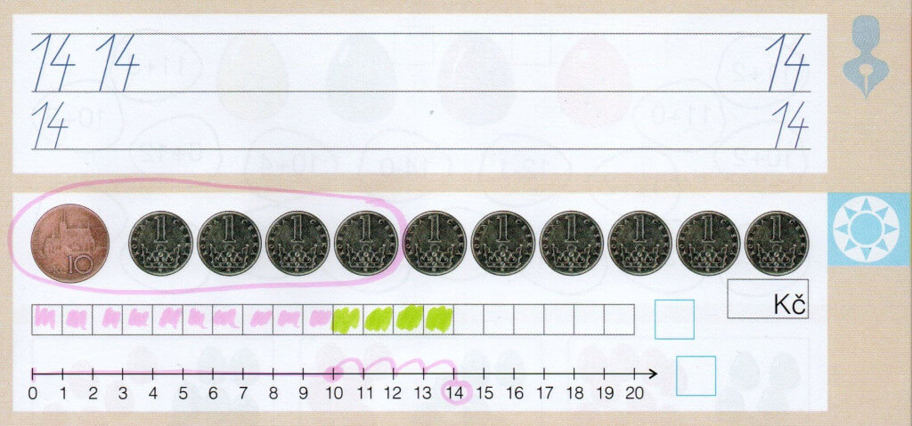 PS str. 11,13, 15, 17, 19/ soustřeď se na cvičení / modré sluníčko (viz foto níže) Znovu opakujeme desítku a jednotky, přidáváme tentokrát znázornění na číselné ose a představu peněžní hodnoty. Mají děti povědomí o tom, co si za 11 . 15,- Kč mohou přibližně koupit? Zeptejte se jich na to…