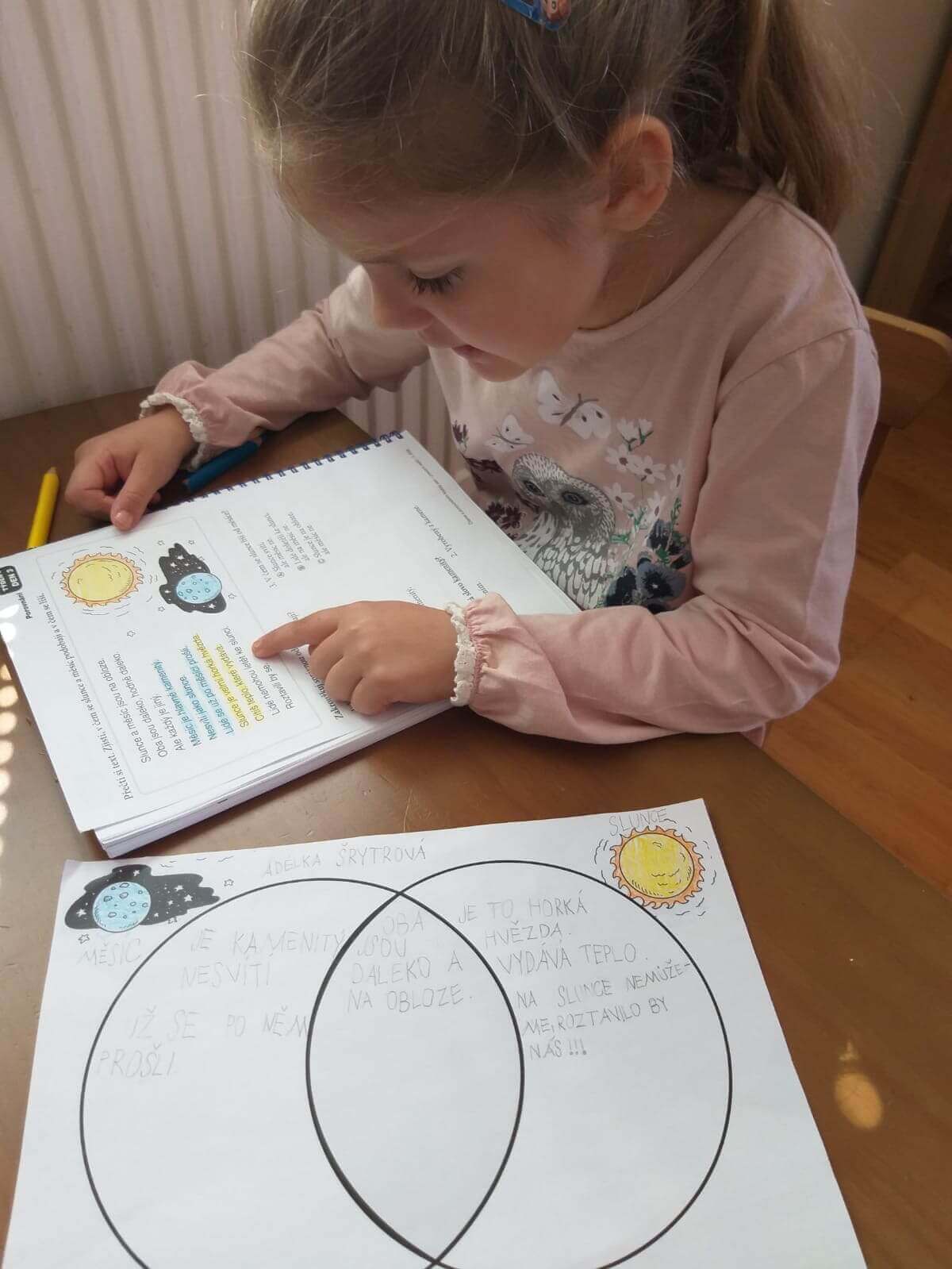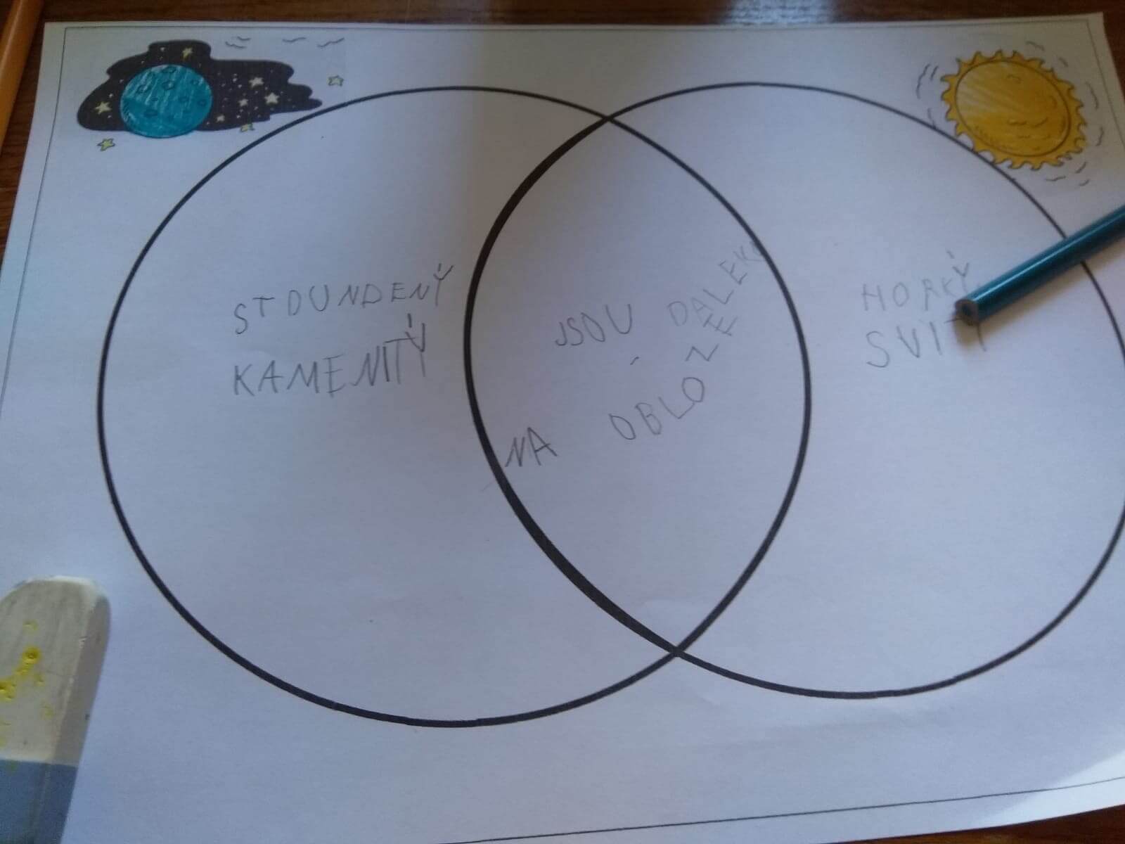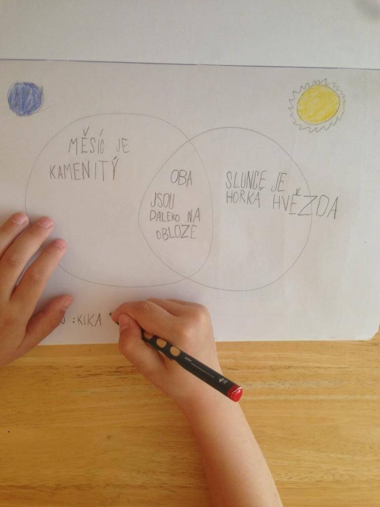 Teď, když už jsme si uvědomili, že budeme porovnávat slunce a měsíc, budeme hledat, co mají společné a co rozdílné, můžeme číst. Věty patřící ke slunci jednou barvou, to co patří měsíci zase tou druhou…..