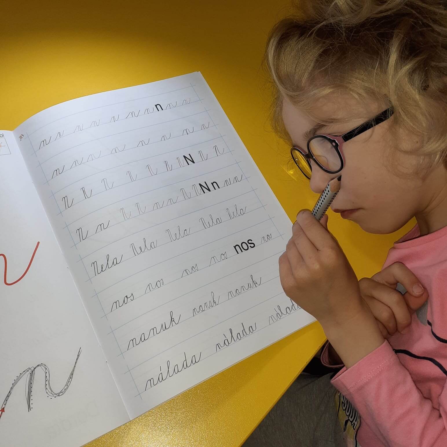 Všechna velká psací D, která mi dnes přišla, jsou velice zdařilá. Klobouk dolů. Malé a velké psací nN budeme mít dnes také bez potíží. Kopec, jeden štíhlý prstík a odtah. Nebo. Hůlka, jeden štíhlý prst a odtah. A je to. Pišme!