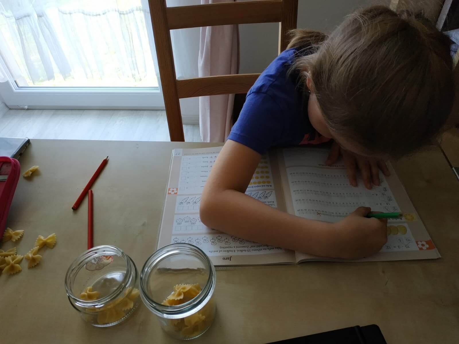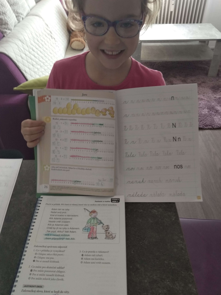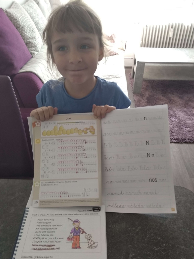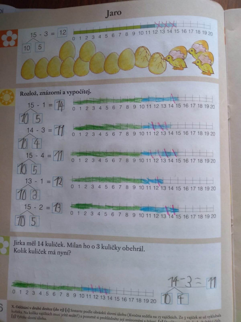 Jsme-li si jisti, že dítko práci rozumí, jdeme do sešitu. PS str. 26 / sluníčko. Většina dětí udělá práce úplně snadno. Vypočítám příklady, vyznačím „kroky“ na ose. Velkou obtíží může být nucený rozklad čísel. Rozumí-li dítě principu odčítání na skleničce, není nutné ho do rozkladů zbytečně nutit.