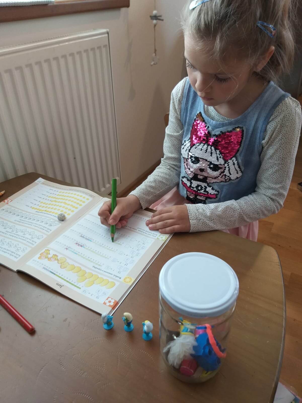 Pro většinu dětí bude vhodné začít opět manipulací s předměty /Sklenička a jednotky/, aby si uměly učivo lépe představit. A opět bych zkusila zaznamenávat nejprve na papír.“